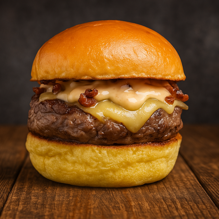200g de carne madurada 30 días, queso edam, mermelada de bacon y salsa mayo siracha